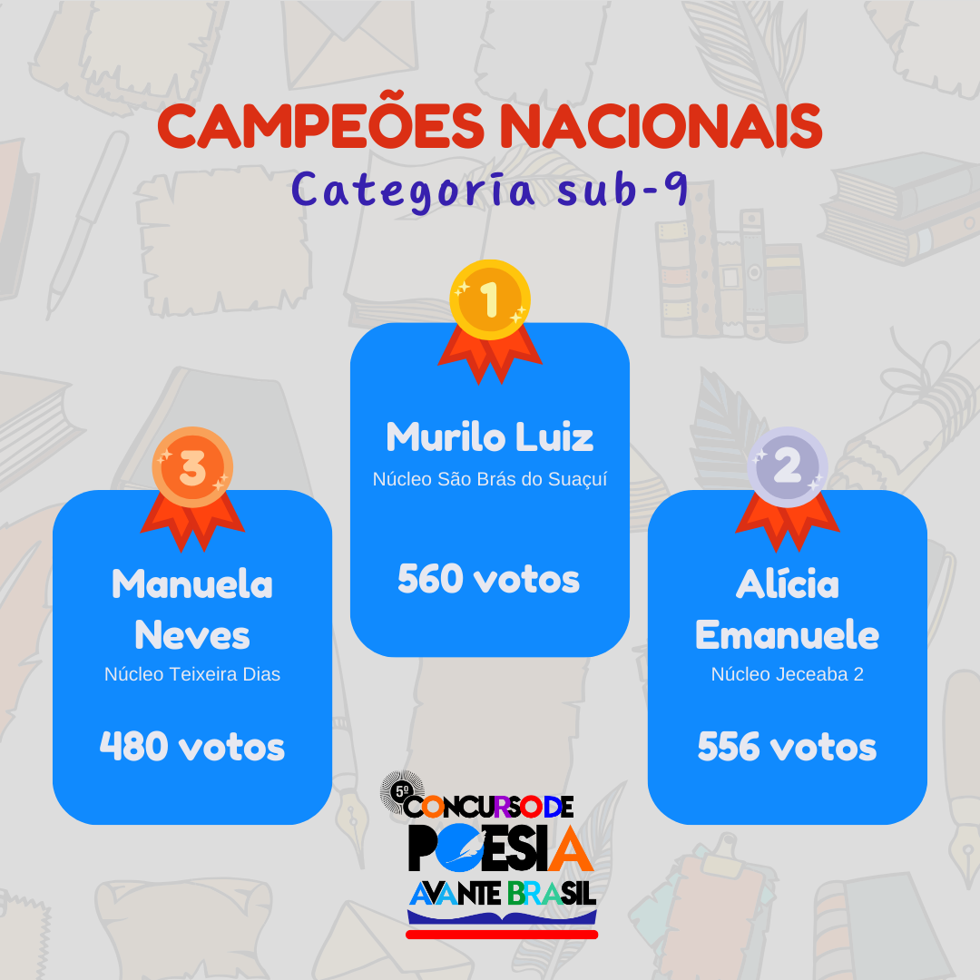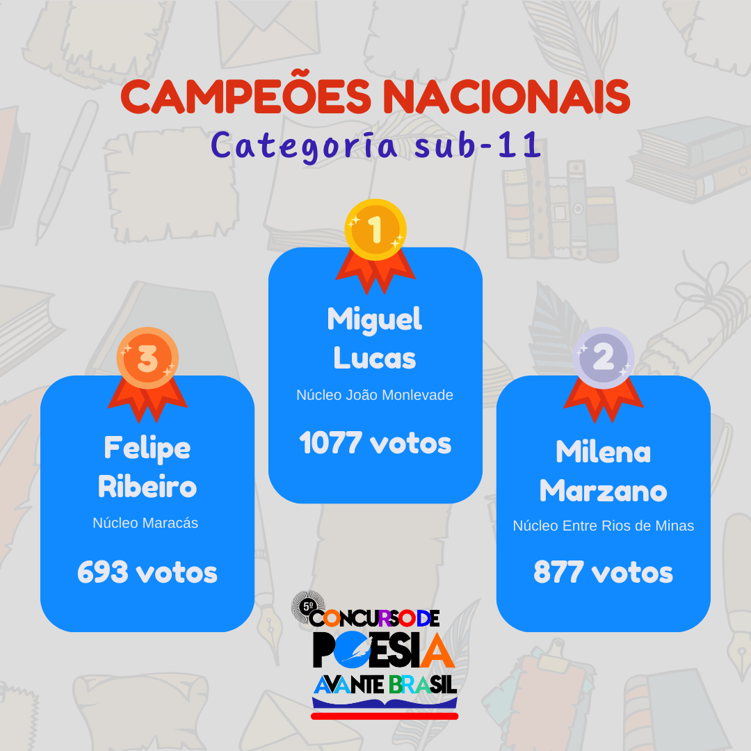 A etapa nacional do 5º Concurso de Poesia Avante Brasil foi encerrada no dia 8 de abril. Com mais de 3000 votos, os beneficiários Murilo Luiz, Miguel Lucas e Davi Dias foram os grandes campões das categorias sub-9, sub-11 e sub-15.