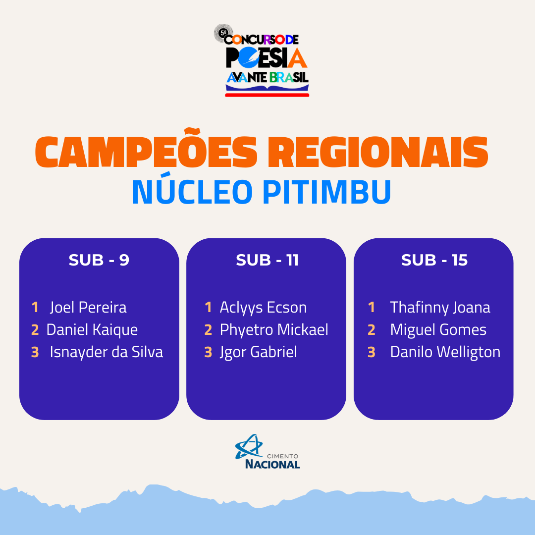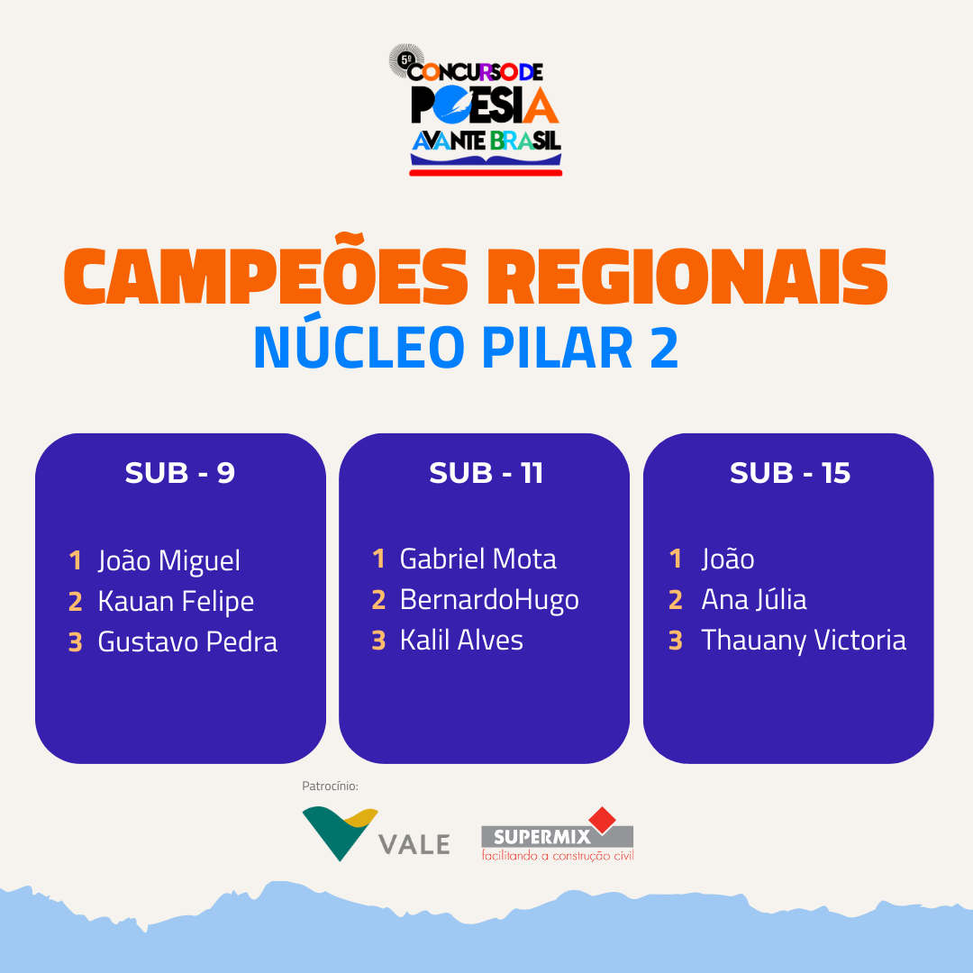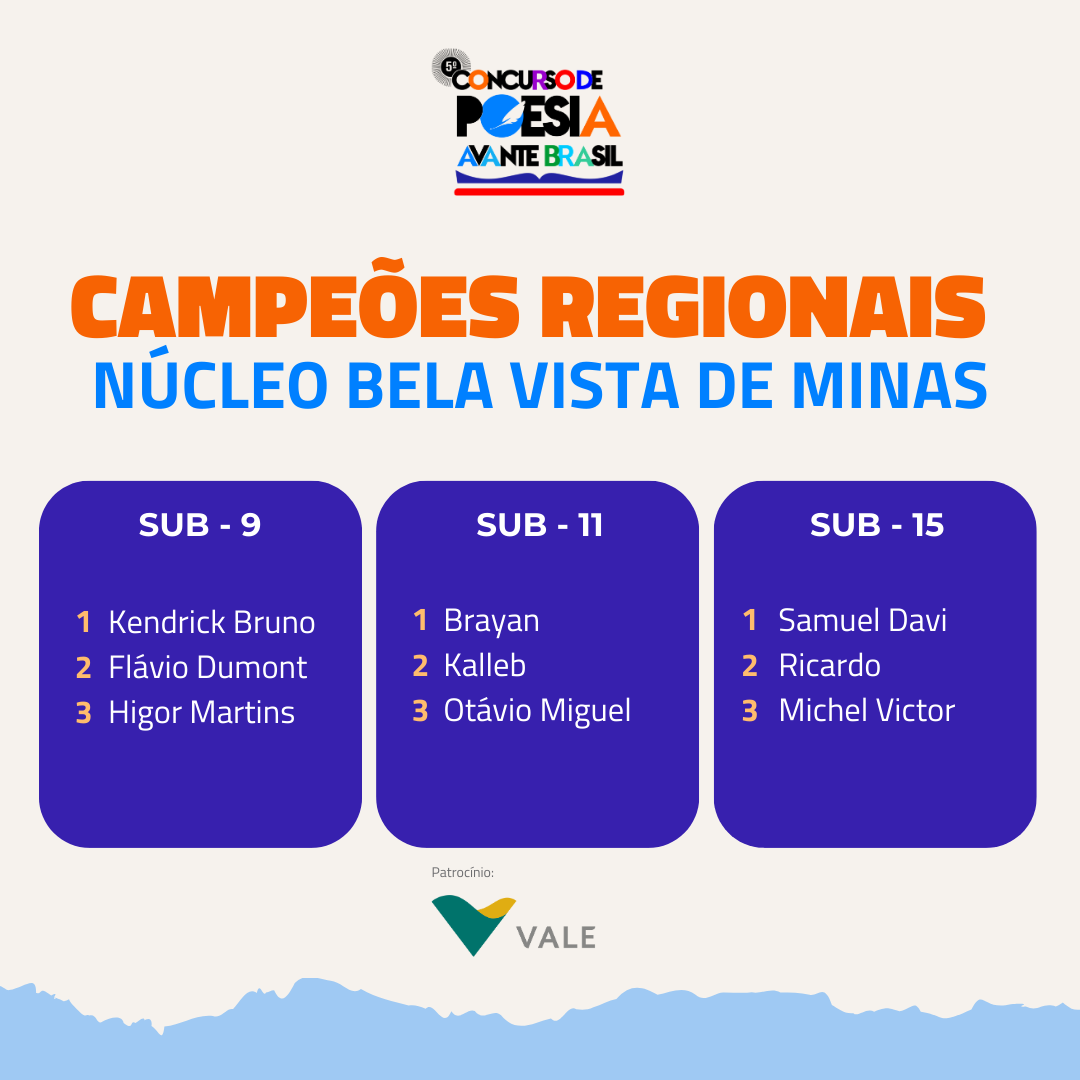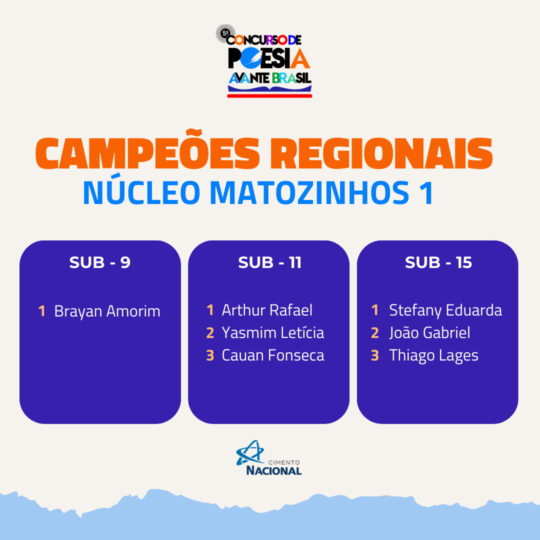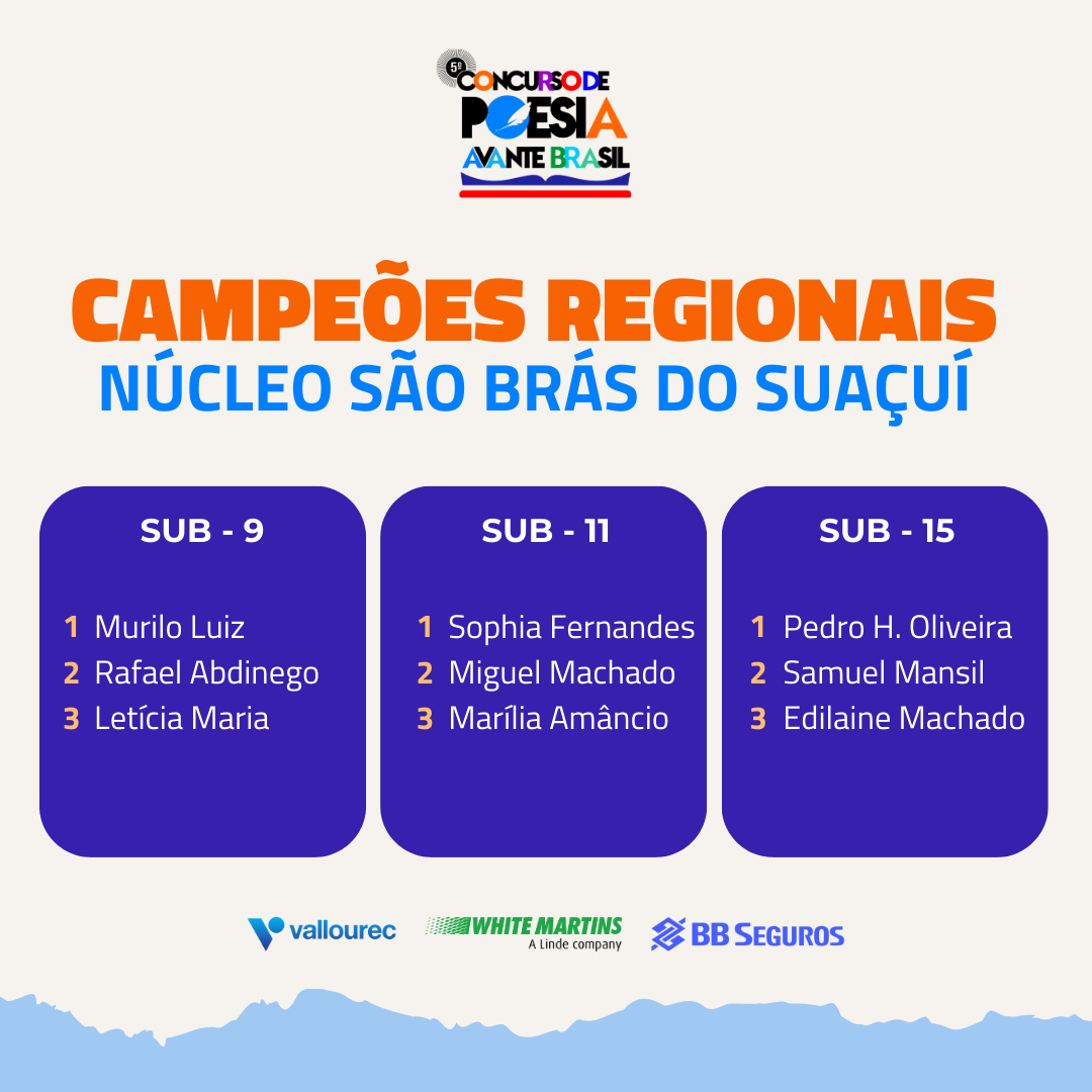 A etapa regional do 5º Concurso de Poesia Avante Brasil terminou no dia 11 de março, com o tema “O esporte como forma de inclusão”, os beneficiários escreveram poesias de no máximo uma lauda. Entre os dias 12 e 14 de março, os professores dos núcleos fizeram uma pré seleção das poesias, escolhendo 5 poesias de cada categoria (sub-9, sub-11 e sub-15). Após essa seleção, no dia 18 de março as poesias foram enviadas para um banca avaliadora, que escolheu os três primeiros colocados de cada núcleo, assim montando o pódio regional.