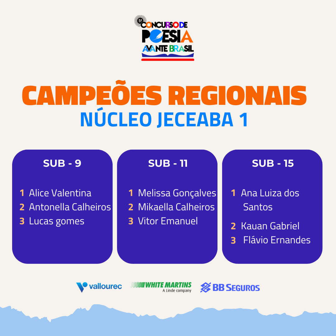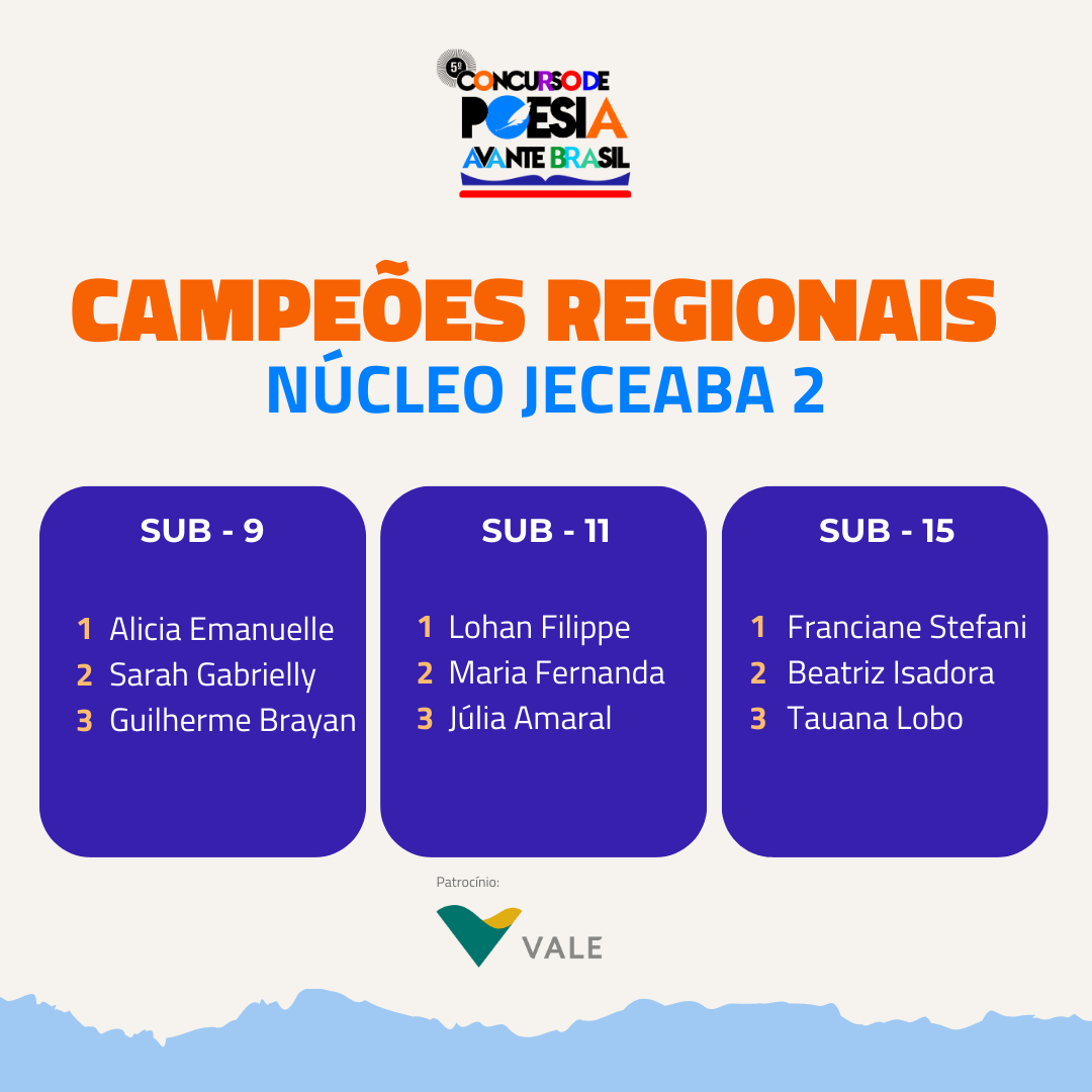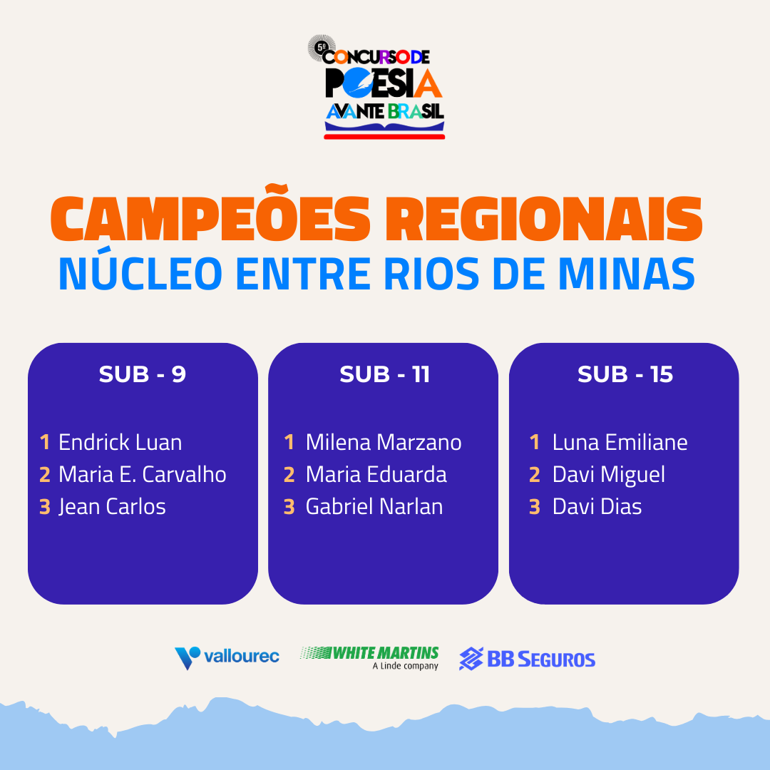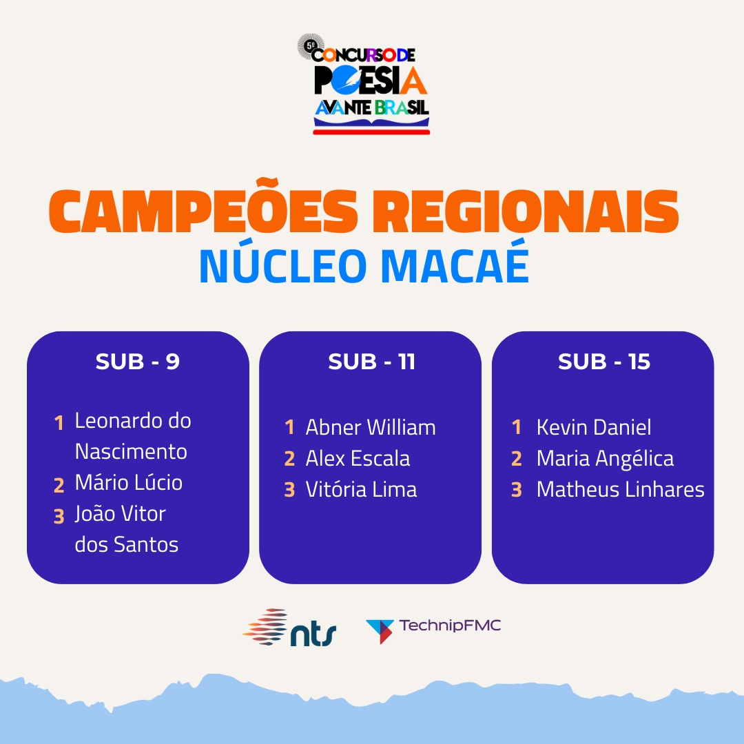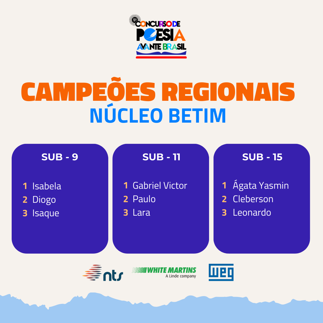 A etapa regional do 5º Concurso de Poesia Avante Brasil terminou no dia 11 de março, com o tema “O esporte como forma de inclusão”, os beneficiários escreveram poesias de no máximo uma lauda. Entre os dias 12 e 14 de março, os professores dos núcleos fizeram uma pré seleção das poesias, escolhendo 5 poesias de cada categoria (sub-9, sub-11 e sub-15). Após essa seleção, no dia 18 de março as poesias foram enviadas para um banca avaliadora, que escolheu os três primeiros colocados de cada núcleo, assim montando o pódio regional.
