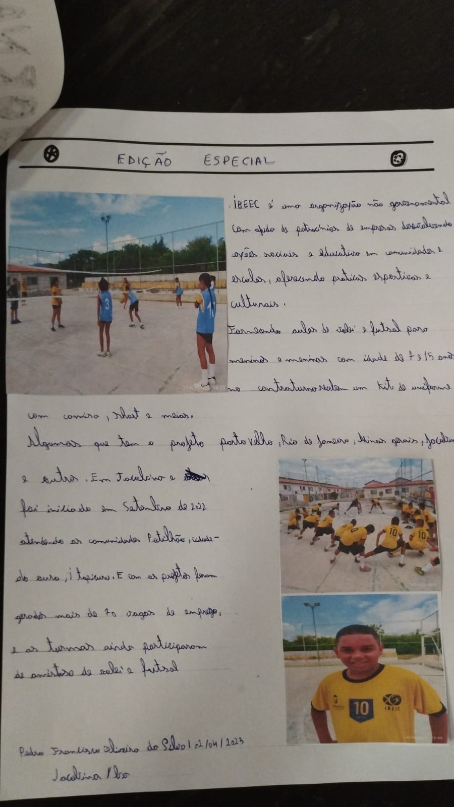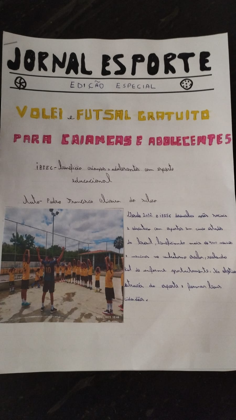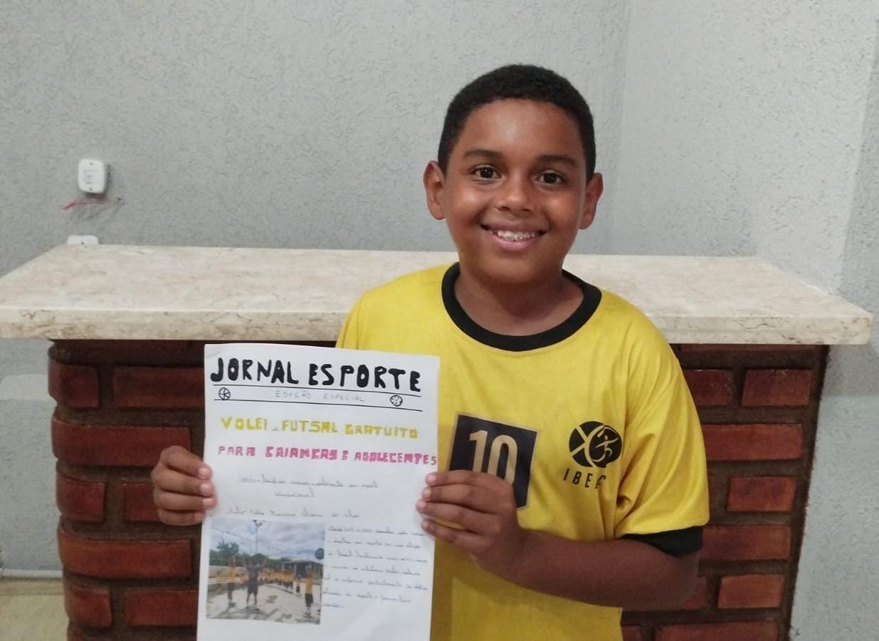 Aluno do ensino fundamental desenvolve jornal esportivo para trabalho escolar. Inspirado pelo seu dia a dia em quadra, o beneficiário do núcleo Jacobina usou o projeto do IBEEC como tema principal de sua reportagem.