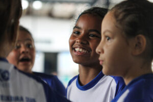 Entre dribles e chutes a gol, elas ajeitam os coletes e não perdem o foco no jogo. Todas as meninas que escolhem o futsal